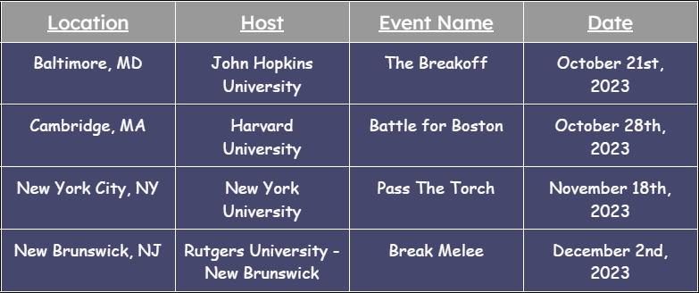 Double Take, representing the University of Massachusetts, Boston, took home the 2023-24 national championship at Pack the House, hosted by NU Breakers. Their victory capped off an incredibly successful season, featuring wins at Harvard’s Battle for Boston and NYU’s Pass the Torch. We congratulate UMass Boston for an amazing season and are excited to see what the future holds for all the crews who competed with us this season!